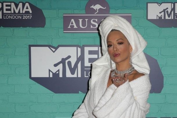 На голове певицы красовалось банное полотенце, как будто она только что приняла душ. Свой необычный образ звезда дополнила украшениями с бриллиантами и туфлями в тон.