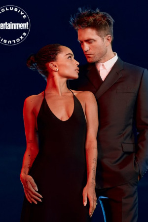 Зои одета в черное платье с открытой спиной и глубоким вырезом в зоне декольте, а Роберт позирует в брючном костюме серого оттенка.