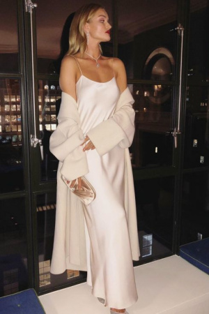 На фото 32-летняя Роузи запечатлена в очень красивом вечернем платье белого цвета на тонких бретельках. Оно сочеталось с туфлями на каблуках в тон, а также длинным пальто молочного цвета.