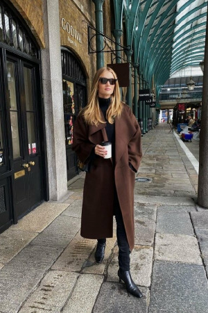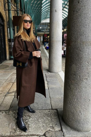 Узкие ботинки с квадратным носком и низким скульптурным каблуком не просто удобные – это еще и главный тренд текущего и нового сезонов. Модель Роузи Хантингтон-Уайтли, которая вместе с Джейсоном Стэтхемом продает свой особняк, уже запаслась фирменными ботильонами шведского бренда Totême. Обувь она удачно сочетает с очень красивым пальто оттенка темный шоколад.