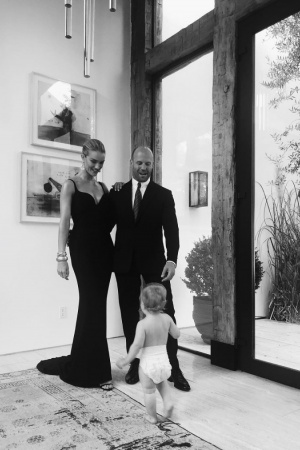 На черно-белых кадрах Роузи позирует вместе с мужем. Супруги как раз собирались ехать на премьеру фильма "Мег", где Джейсон сыграл главную роль. Но их 13-месячный сын решил, что родителям можно и пропустить светское мероприятие.