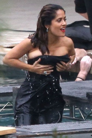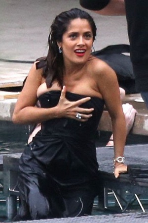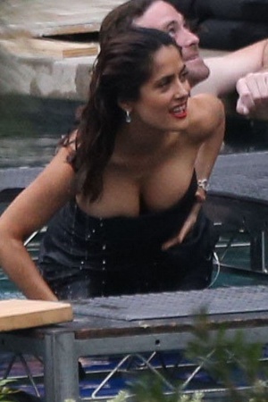 На публике красотка появилась в тесном черном платье, под которым не помещалась пышная грудь актрисы: Сальма смущенно поправляла наряд, пытаясь скрыть свои роскошные формы.