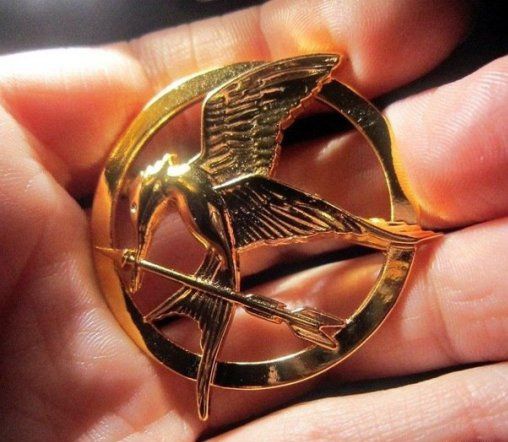 14. На обложке самого первого издания "Голодных игр" были изображены вымышленная золотая птица сойка-пересмешница и стрела, вписанные в круг. В кино так выглядела брошь, полученная Китнисс перед своим отправлением на Голодные игры.