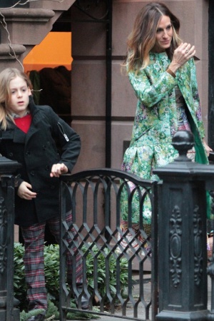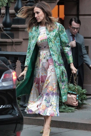 Сара Джессика Паркер попалась в объективы папарацци при полном, что называется, параде! Звезда "Секса в большом городе" "порылась в гардеробе" своей героини Керри Брэдшоу и нашла там яркое длинное платье с геометрическим узором, зеленое пальтишко в цветочек, желтые туфли (тоже не однотонные) и украшенную бирюзовыми вставками сумочку. Сопровождал ее супруг Мэтью Бродерик, также одетый самым парадным образом.