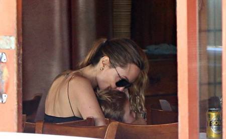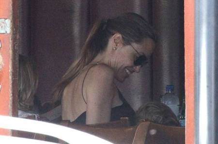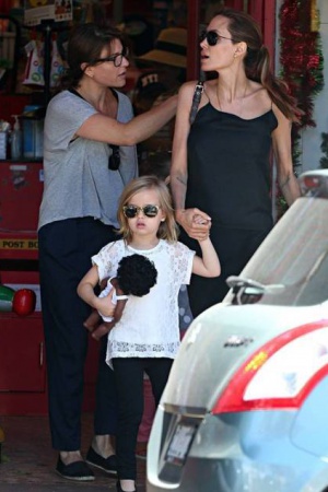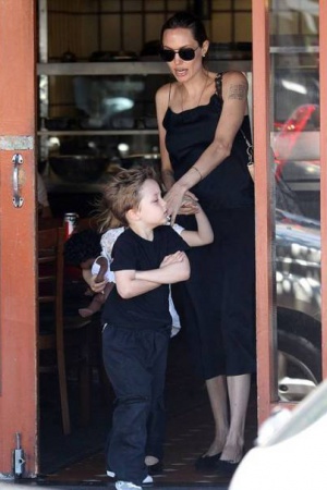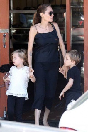Анджелина, как и прежде, не изменяет своему любимому чёрному цвету, выбирая длинные юбки в пол и тонкие топы, подчёркивающие её внушительный бюст. Однако мрачный цвет разбавляла счастливая улыбка Джоли, которая освещала её лицо любовью - актриса с удовольствием наблюдала за своими детьми и радовалась их проказам!