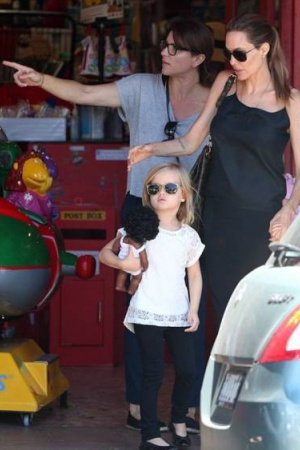 В эту субботу Энджи сфотографировали вместе с двумя детьми на прогулке, который плавно перешёл в шоппинг - близнецы Нокс и Вивьен упросили маму заглянуть в магазин игрушек.