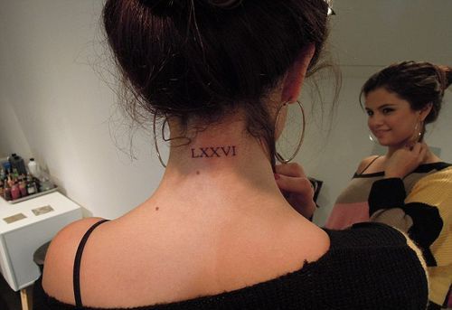 Селена Гомес не осталась в стороне от моды на татуировки. Недавно звезда украсила свое тело новой надписью. Теперь на ее шее красуется число 76, написанное римскими цифрами.