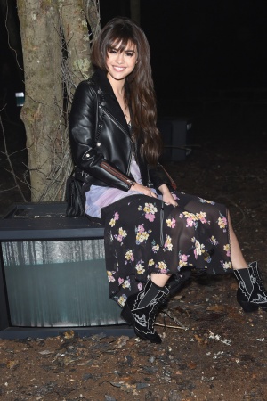 На этот раз Гомес нарастила длинные волосы и сделала косую челку. А подчеркнула новый имидж певица нарядом в стиле 70-х: цветочное платье в пол и кожаную косуху знаменитость дополнила черно-белыми сапогами.