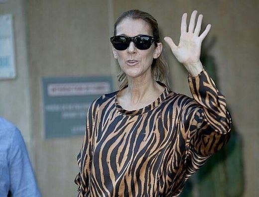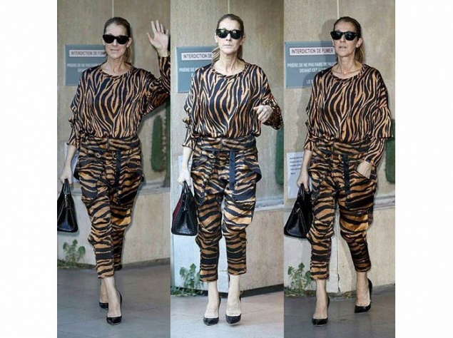 Папарацци удалось застать Дион у выхода с отеля, в котором она остановилась. Певица была одета в шелковый комбинезон с тигровым принтом, обильно украшенный молниями и металлическими кнопками в области живота.