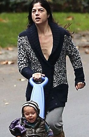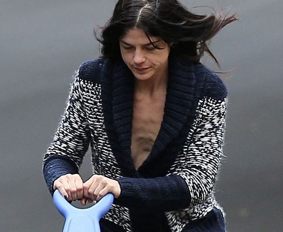 Сэльма вышла на прогулку с сыном в теплом кардигане, под который забыла надеть топ. Откровенное декольте открыло папарацци жуткое зрелище – выпирающие ребра актрисы.