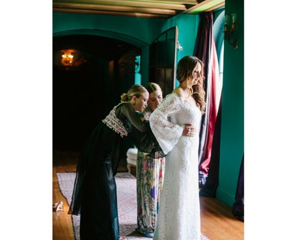 Мэри-Кейт и Эшли прославились благодаря ролям в кино, где снимались с юного возраста. Повзрослев, предприимчивые девушки принялись за дизайн и запустили несколько марок, под которыми выпускают одежду и аксессуары и благодаря которым заработали огромное состояние. А недавно сестры решили попробовать свои силы в свадбеной моде. Мери-Кейт и Эшли создали свой первый свадебный наряд для своей подруги Молли Фишкин. Платье получилось классическим, с приталенным силуэтом и расклешенным рукавом и длинной белоснежной фатой. Своим творением девушки явно остались довольными, так как с удовольствием фотографировались вместе с подругой на свадебном торжестве, где стали одними из почетных гостей.