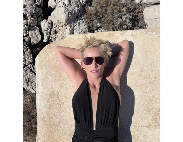 63-летняя знаменитость позировала на фоне скал и океана. Стоун лежала прямо на камне в черном сдельном купальнике и солнцезащитных очках.