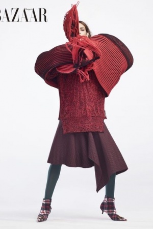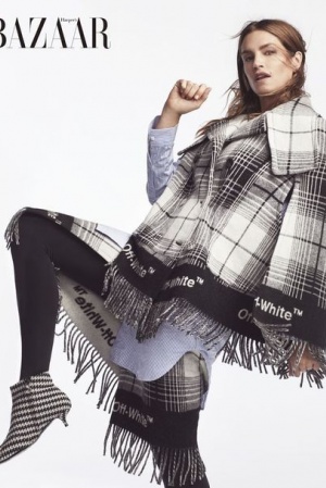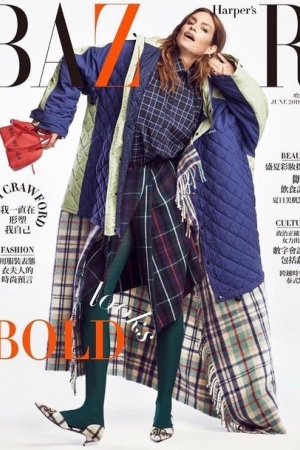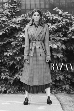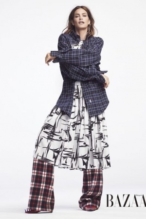 На страницах свежего номера глянца 52-летняя модель продемонстрировала ключевые тренды осени 2018 - клетчатые наряды, которые можно отнести к вневременной осенней классике, плотные колготы и верхнюю одежду в стиле oversize, включая объемные жакеты, пиджаки и тренчи свободного кроя.