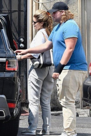 Парень был одет в синюю футболку и светлые джинсы. Сын "железного" Арни спрятал свою голову, надев кепку, из-под которой виднелись длинные волосы.