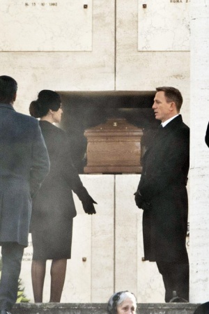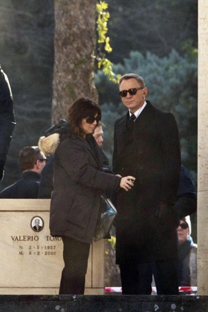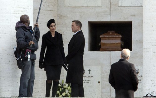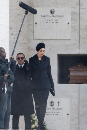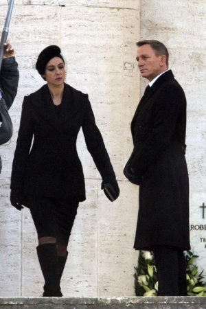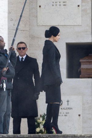 Моника, как известно, сыграет одну из второстепенных ролей в новом фильме о Джеймсе Бонде. И, судя по кадрам со съемочной площадки, ее героине придется не сладко. В итальянской столице снимали сцену похорон, на которые Беллуччи прибыла в сопровождении импозантного Крэйга. Элегантный черный костюм подчеркивает прекрасную фигуру 50-летней итальянки, а шляпка с вуалью, кажется, делает ее образ еще более изящным и загадочным.