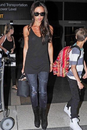 На днях звездную модницу сфотографировали в лос-анджелесском аэропорту с детьми: Виктория выбрала для перелета трендовые рваные джинсы, черный топ и замшевые полусапожки на высоком каблуке.