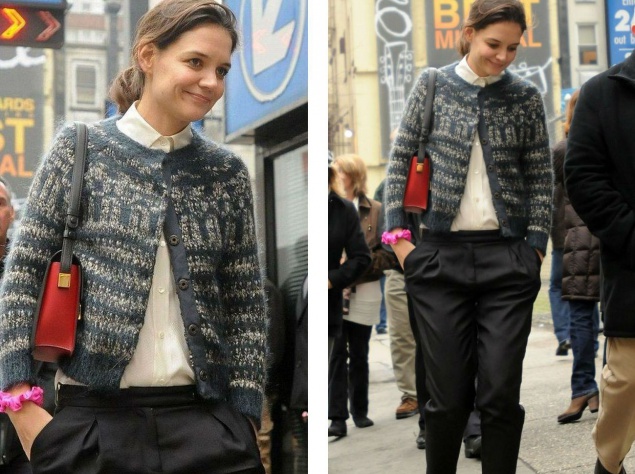 Всемирно известная красотка отправилась на прогулку по Нью-Йорку в рубашке, наглухо застегнутой на все пуговицы, сверху которой накинула теплый вязаный кардиган, и в широких штанах, скрывающих стройные ноги Кэти.