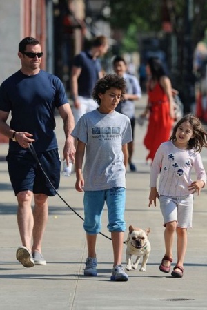 В День отца Хью, Оскар, Ава и их французский бульдог гуляли по парку в Нью-Йорке и наслаждались солнышком.