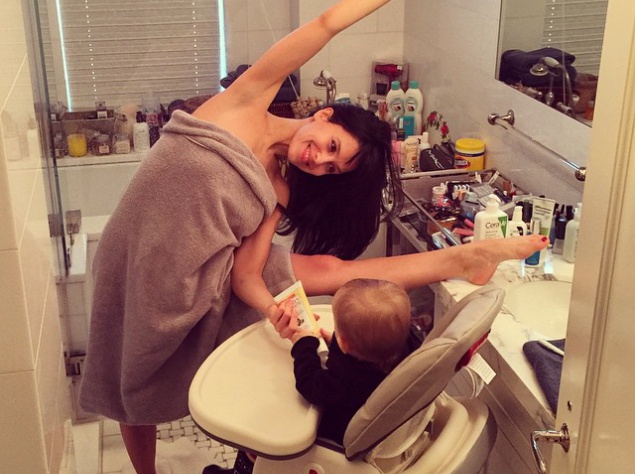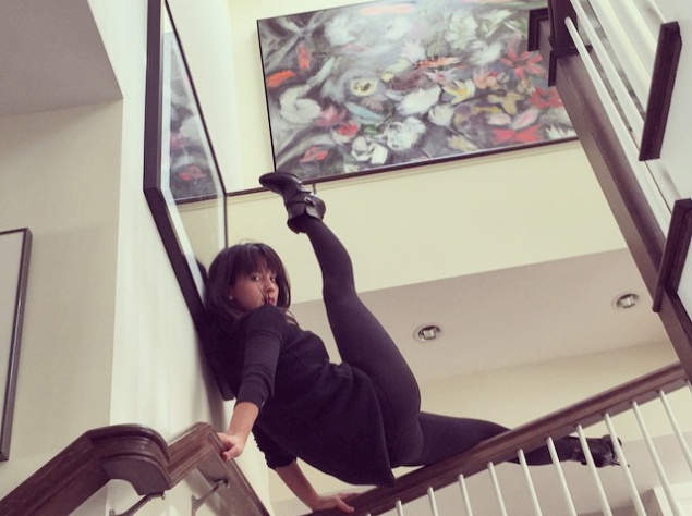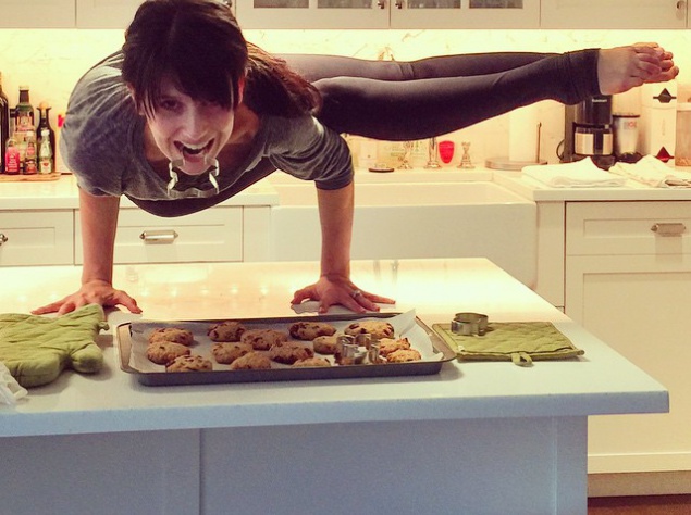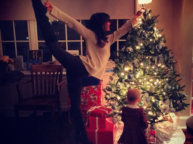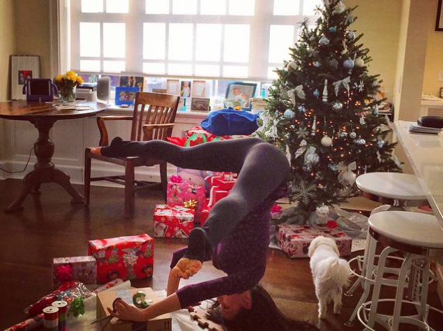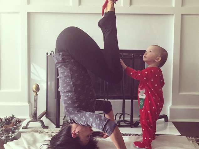 Стоя на руках или на "мостике", Хилари наряжает елку, упаковывает подарки, выносит мусор, кормит ребенка, разбирает почту и даже целуется с мужем.
