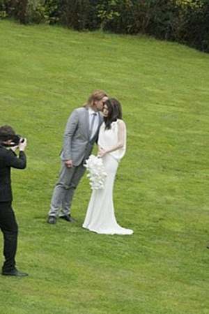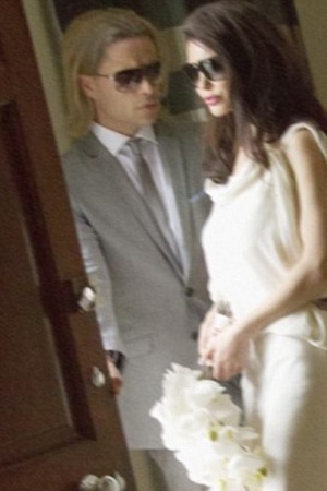 Невеста с распущенными каштановыми волосами и пухленькими губами в простом элегантном платье, жених-блондин с удлиненной мужской прической в сером костюме издалека невероятно похожи на Джоли и Питта.