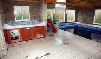 Хозяин этого бассейна явно пошел дальше всех, установив еще и ванну с горячей водой, однако затем разбил ее и оставил осколки валяться на полу, где, впрочем, они оказались не в одиночестве. Двор завален шинами, что демонстрирует любовь хозяина этого дома к автомобилям. На кухне можно увидеть дверь, прислоненную к стене. Это говорит о том, что хозяин стремится сделать даже самые элементарные вещи, типа вхождения в комнату, еще проще.