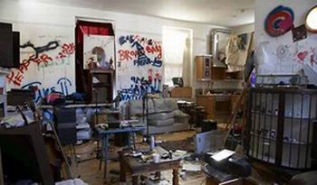 Посмотрим на следующую комнату. Граффити на стенах говорят о том, что хозяин этого помещения человек творческий, обладающий ультрасовременным вкусом. Журнальный столик, небрежно усыпанный остатками еды и алкоголя со вчерашней вечеринки, показывают, что жилец - человек веселый, душа любой компании.