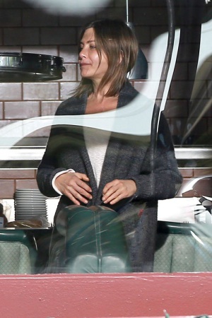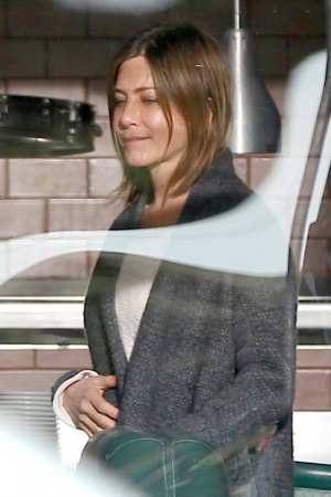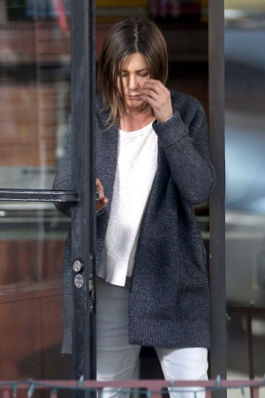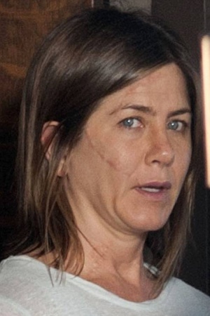 Дженнифер Энистон на съемочной площадке, со шрамами на лице и выглядящей на все свои 45 лет. Актриса продолжает сниматься в фильме "Cake", где играет женщину, пережившую автокатастрофу.