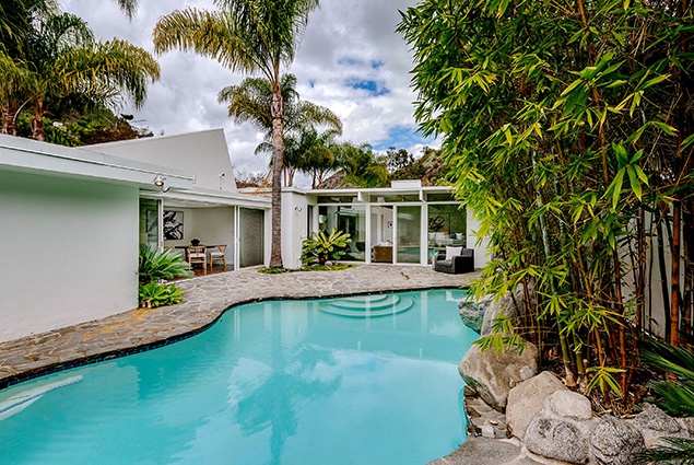 Задний двор при особняке буквально утопает в зелени: вокруг бассейна высажены пальмы и бамбуковые деревья.