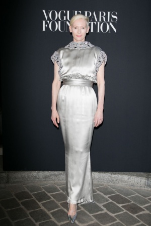 Для своего выхода артистка выбрала не менее необычное, чем она сама, платье. Фотографам в этот вечер Тильда позировала в шелковом серебристом наряде в пол с широким поясом, подчеркивающим ее талию, и с вышивкой из бисера и камней. Свой образ светловолосая актриса дополнила туфлями в тон к платью и минимальным мейкапом. Получилось сказочно!