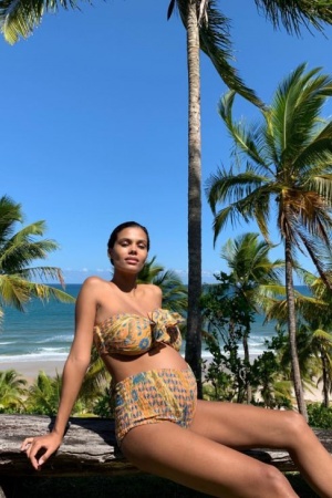 В этот раз Кунаки демонстрирует подросший живот в пестром купальнике с высокими трусами, натянутыми аж на живот. Сложно не обратить внимания и на грудь модели - она в разы увеличилась, и это, конечно, связано с беременностью.