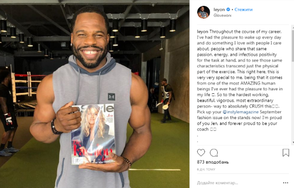 Пару дней назад в своем Инстаграм он поделился фото, на котором держит в руках журнал InStyle с Дженнифер на обложке. Кадр сопровожден подписью: "Самый удивительный и невероятный человек, с которым я имел удовольствие общаться в своей жизни. Работоспособная, энергичная, красивая... Я горжусь тобой, Джен, и я горд быть твоим тренером".