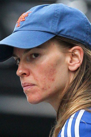 "Малышка на миллион", сейчас увы на столько не выглядит. То ли у актрисы проблемная кожа лица, то ли Хилари только что покинула косметологический кабинет, где проходила процедуру пилинга, пока не ясно.