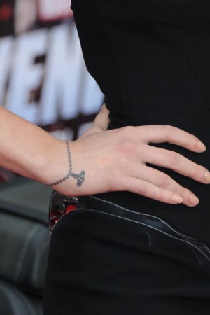Во время промоутинга нового фильма "Мстители" 27-летняя актриса Скарлетт Йоханссон продемонстрировала свое новое тату на запястье в виде браслета с надписью "Я люблю Нью-Йорк".