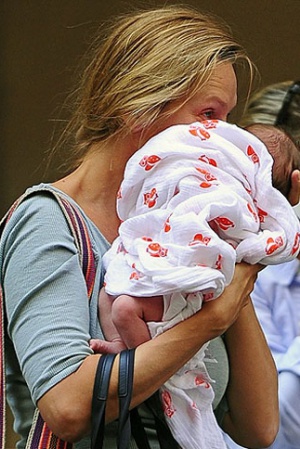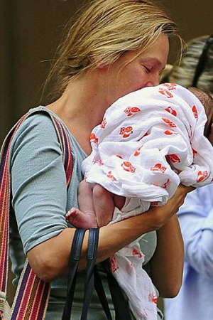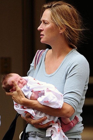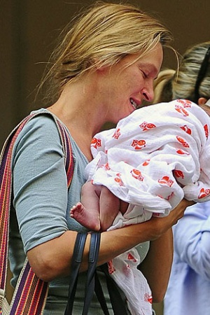 Накануне 42-летняя любимица Квентина Тарантино была замечена в самом центре Нью-Йорка. Она бережно прижимала к груди и осыпала поцелуями свой "драгоценный груз", завернутый в детское одеяло. На снимках папарацци, которыми поделилась блогер Aia0604, Ума Турман продемонстрировала стандартный "набор" обычной реальной новоиспеченной мамочки в первые недели после родов: волосы, собранные жгутом, полное отсутствие макияжа, серые брюки с подвернутыми штанинами, бледно-голубой топ и черные балетки. Имя малышки в полосатых ползунках, которую фотографы засняли безмятежно дремлющей на маминых руках, пока не раскрывается.