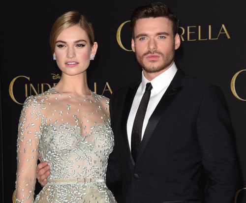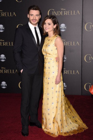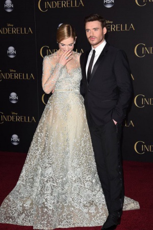 Лили Джеймс, которая исполнила роль Золушки, выглядела на красной дорожке как настоящая принцесса. Она прибыла на премьеру в роскошном вечернем платье Elie Saab. Ричард Мэдден, которому досталась роль принца, был безукоризненно элегантен в черном смокинге, белоснежной рубашке и узком черном галстуке. На показ он явился со своей девушкой Дженной Коулман.