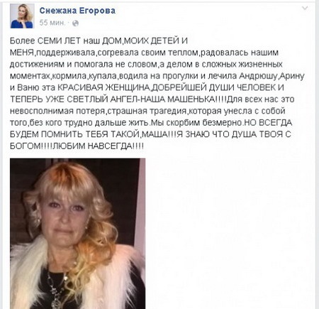 Снежана рассказала, что для ее семьи смерть няни Марии – невосполнимая утрата, так как она за семь лет работы в ее доме стала полноценным членом семьи. Егорова призналась, что Мария была всегда рядом и помогала воспитывать всех ее четверых детей.