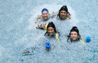 В кадре можно увидеть Кейт Уинслет, Клифф Кертис, Зои Салдана и Сэм Уортингтон, которые находятся в бассейне. Звезды одеты в специальное снаряжение и улыбаются - очевидно, после одной из удачных сцен.