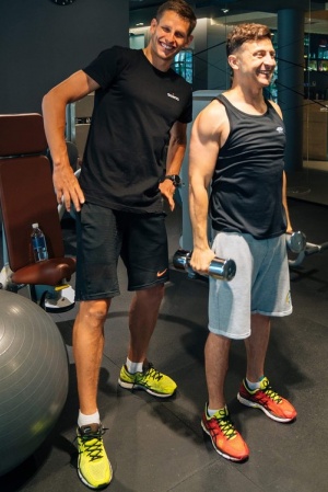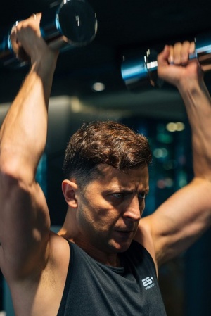 Так, на днях комик поделился снимками с очередной тренировки на личной странице в Instagram. На первом фото Зеленский с фитнес-тренером широко улыбаются на камеру. А вот на втором снимке видно, как сосредоточено юморист выполняет упражнение с гантелями в руках.