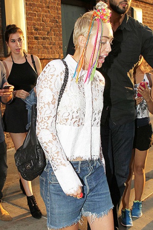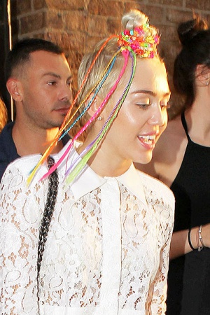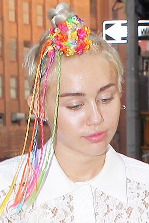 Фотографам удалось сделать снимки 21-летней звезды с весьма необычной прической: свои короткие волосы она украсила разноцветными косичками, ленточками и яркими буквами. Это не удивительно, для Сайрус это норма.