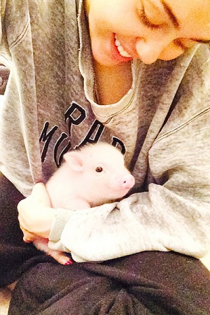На фотографиях из Instagram Сайрус держит своего питомца на руках, в то время как ассистент певицы красит копытца минипига алым лаком для ногтей.