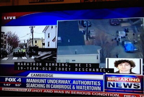 Американская актриса и певица Зои Дешанель на некоторое время стала бостонским террористом, по крайней мере, в глазах зрителей телеканала города Далласа Fox 4 Dallas-Fort Worth.