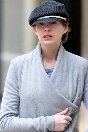 При этом на голове Хэтэуэй наконец-то красовался головной убор нормального размера. Она отважилась расстаться с очень некрасивым бини огромного размера и отдала предпочтение элегантному черному кепи с бело-золотым декором.