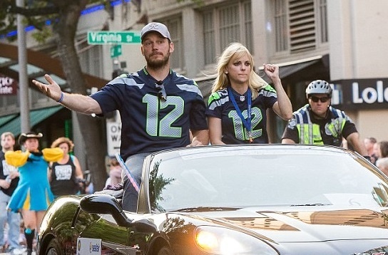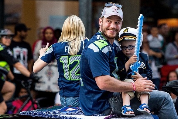 Крис Прэтт и Анна Фэрис с сыном Джеком отправились на ежегодный парад Seafair Torchlight в Сиэтле. В субботний волшебный вечер огней, гигантских воздушных шаров, лент, клоунов и хорошего настроения звездная семья заняла место в черном "корвете".