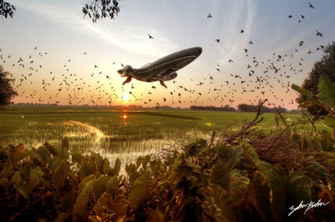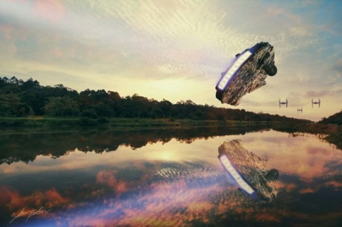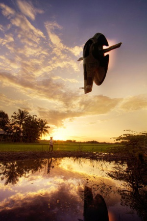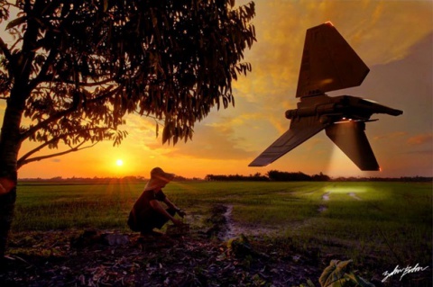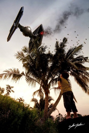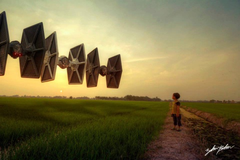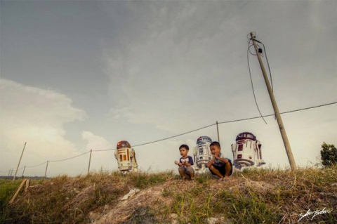 При помощи фотоманипуляций и коллажирования по обочинам дорог на родине фотографа, в Танджун Каранге, маршируют дроиды, а в небе летают имперские истребители.