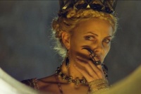 Роль той самой королевы, произносящей слова «Кто на свете всех милее...» досталась потрясающей Шарлиз Терон. Складывалось впечатление, что актриса полностью вжилась в новый образ жестокого тирана. Ее величие и красота заполнили все мелкие огрехи фильма. Великолепная игра Терон казалась ведущей в «Белоснежке и Охотнике», не смотря на то, что по идее, все же Стюарт должна была стать центром внимания...