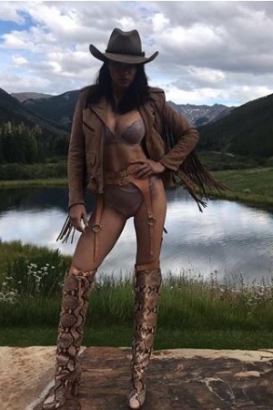 Свій образ красуня доповнила ботфортами із забарвленням під шкіру змії, підтяжками тілесного кольору, замшевою курткою і сірим капелюхом.