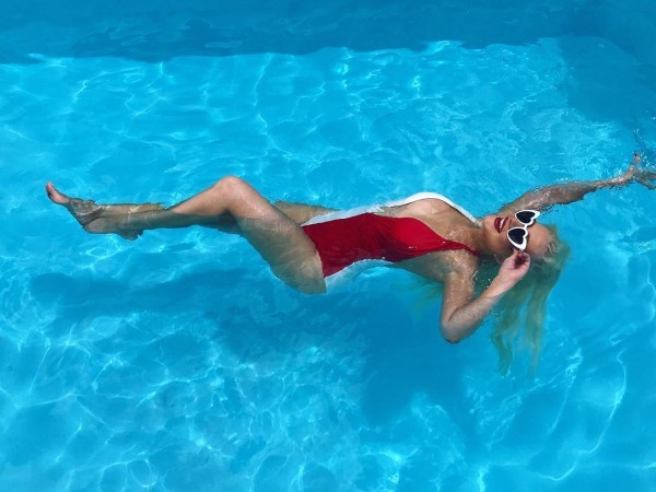 На фотографіях Кристина позує в купальнику з відвертим вирізом, який підкреслює її пишні груди.