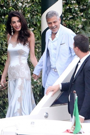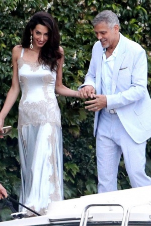 55-річний актор і його 38-річна дружина завітали на сімейну вечірку до Білла Мюррея, яка проходила на озері Комо. Увага папараці була прикута до неймовірно красивого та вишуканого образу Амаль Клуні. Жінка прийшла на свято у розкішній шовковій сукні, а лук доповнила елегантними дорогоцінностями.