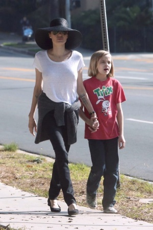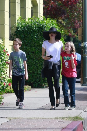 Анджеліну помітили в Лос-Анджелесі на обіді з дітьми. Зірка відправилася в місцевий суші-бар разом з Вівьен, Паксом і Ноксом. Для виходу Анджеліна вибрала трохи незвичний для себе образ - білу футболку, джинси і капелюх.