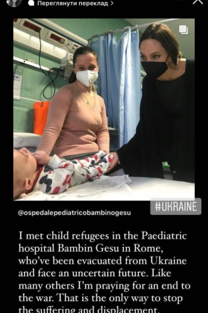 "У педіатричній лікарні Bambino Gesu у Римі я зустрілася з дітьми-біженцями, які були евакуйовані з України та зіткнулися з невизначеним майбутнім. Як і багато інших, я молюся за припинення війни. Це єдиний спосіб припинити страждання та вимушене переміщення людей", — написала Анджеліна.